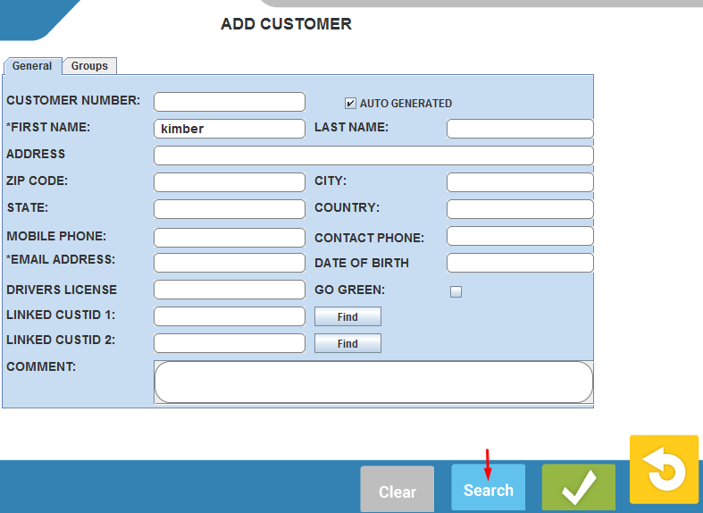 For finding an existing customer: Enter the criteria which you wish to use to find your customer and press the blue search button. Continue to next picture for next steps.