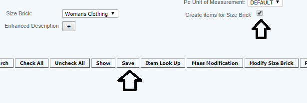 Create the first item on the Master Item screen, enable the Size Brick and select te size brick to be used and press save.