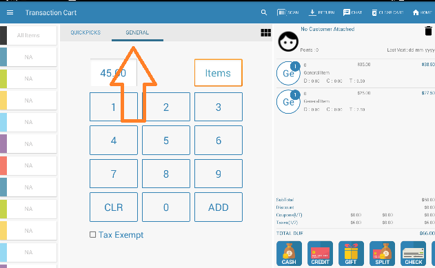 | In the Sales Transaction Screen you have the option of having the Quick Pick access screen as the primary display or, if you primarily use the General Item changing to that screen) The toggle between the two is located along the top bar (with the option of Quick Pick or General) |