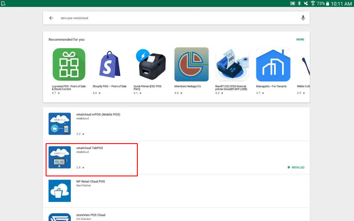 | Once inside the Play store, search for retailcloud POS and select the TabPOS option that populates as shown. Once the app is installed, launch the zeroPOS application. | ![]() |
